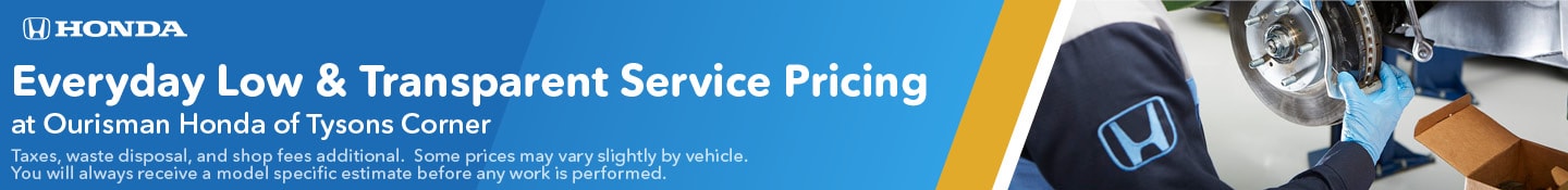 For decades, car owners have worried about what the final bill will be when they bring their vehicles in for service. Auto shops have not always been open about service costs with their customers, but Ourisman Honda of Tysons Corner looks to change that with our service price transparency. Drivers love how easy our Honda service center in Vienna, VA makes it to budget for repairs and service thanks to how upfront we are with pricing. This page highlights prices for common auto maintenance needs along with more details about our team and what we offer.