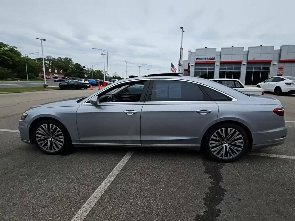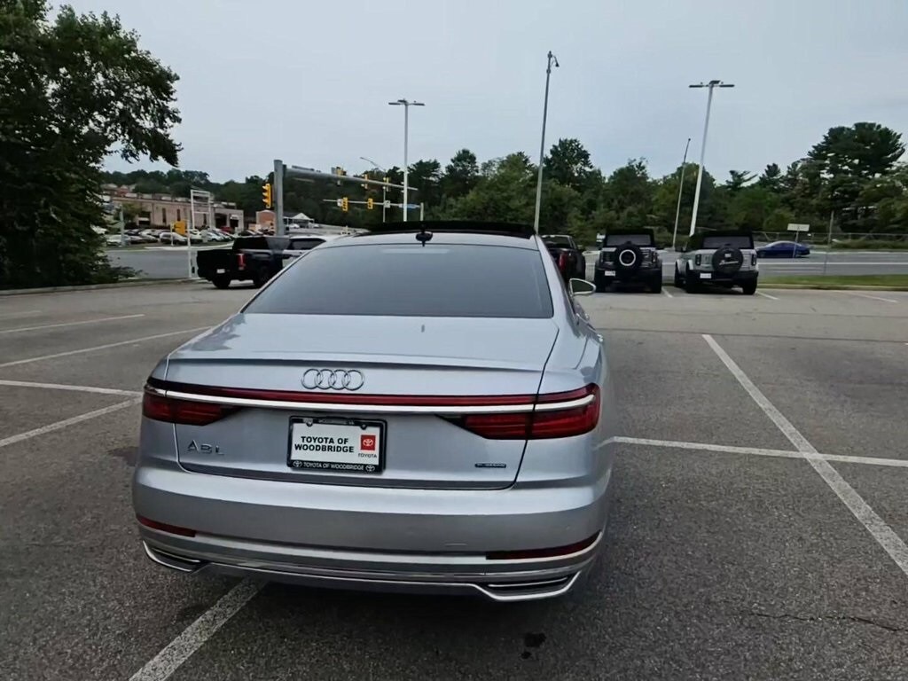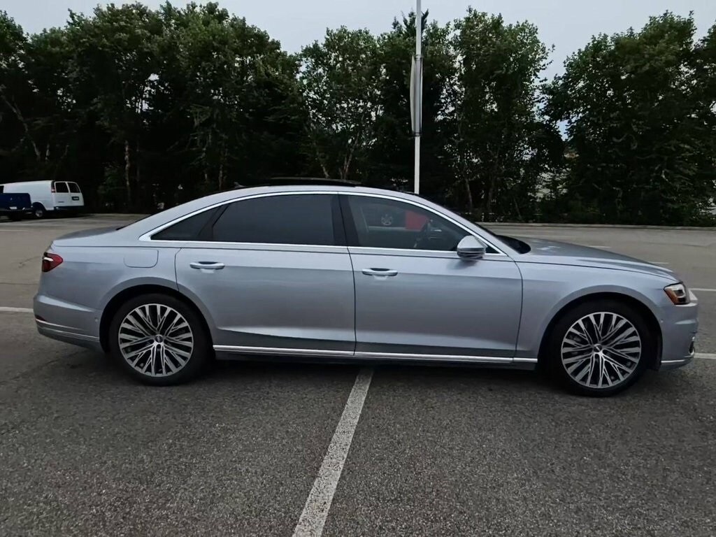 FACTORY WARRANTY, LIKE NEW, DEALER WARRANTY INCLUDED!, Black w/Valetta Leather Seat Upholstery or Valcona Leather Seat Upholstery, 17 Speakers, 4-Wheel Disc Brakes, ABS brakes, Acoustic & Break Resistant Dual Pane Glass, Adaptive suspension, Adaptive Windshield Wiping System, Air Conditioning, Alloy wheels, AM/FM radio: SiriusXM, Audi Active Lane Assist, Audi Adaptive Cruise Assist, Audi Guard Cargo Mat w/A8 Logo, Audi Head-Up Display, Audi Phone Box, Audi Pre Sense Basic & Rear, Audi Side Assist, Audi smartphone interface (Apple CarPlay/Android Auto), Auto High-beam Headlights, Auto tilt-away steering wheel, Auto-dimming door mirrors, Auto-dimming Rear-View mirror, Auto-leveling suspension, Automatic temperature control, Bang & Olufsen 3D Premium Sound System, Brake assist, Bumpers: body-color, Chrome Exterior Package, Cold Weather Package, Compass, Delay-off headlights, Door auto-latch, Driver Assistance Package, Driver door bin, Driver vanity mirror, Dual front impact airbags, Dual front side impact airbags, Electronic Stability Control, Emergency communication system: Audi connect CARE, Executive Package, Exterior Parking Camera Rear, Four wheel independent suspension, Front anti-roll bar, Front Bucket Seats, Front Center Armrest w/Storage, Front dual zone A/C, Front fog lights, Front reading lights, Garage door transmitter: HomeLink, Genuine wood console insert, Head restraints memory, Headlight cleaning, Heated 4-Spoke Multifunction Steering Wheel, Heated door mirrors, Heated Front Seats, Heated front seats, Heated Front Surfaces, Heated Rear Outboard Seats, HVAC memory, Illuminated entry, Intersection Assist, Knee airbag, Leather Shift Knob, Leather steering wheel, Low tire pressure warning, Memory seat, Navigation System, Occupant sensing airbag, Outside temperature display, Overhead airbag, Overhead console, Panic alarm, Passenger door bin, Passenger vanity mirror, Power 2nd-Row Moonroof, Power adjustable front head restraints, Power door mirrors, Power driver seat, Power moonroof, Power passenger seat, Power steering, Power windows, Radio data system, Radio: Audi MMI Navigation Plus, Rain sensing wipers, Rear air conditioning, Rear anti-roll bar, Rear dual zone A/C, Rear fog lights, Rear reading lights, Rear seat center armrest, Rear side impact airbag, Rear Window Blind, Rear window defroster, Remote keyless entry, Seatbelt memory, Security system, Speed control, Speed-sensing steering, Speed-Sensitive Wipers, Steering wheel memory, Steering wheel mounted audio controls, Tachometer, Telescoping steering wheel, Tilt steering wheel, Top View Camera System, Traction control, Traffic Sign Recognition, Trip computer, Turn signal indicator mirrors, USB Cables, Valetta Leather Seat Upholstery, Variably intermittent wipers, Ventilated Comfort Front Seats, Wheels: 20" 20-Spoke Structure Style. 2019 Audi A8 L 55 quattro quattro Florett Silver Metallic 3.0L V6 Turbocharged DOHC 24V ULEV II 335hp